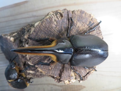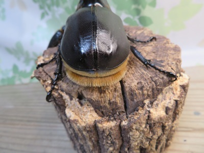 ◎胸角下面から胸部前方側面にかけて黄色いブラシのような微毛で覆われているのが特徴です。ネプチューンオオカブトにある、胸部中央にある小さな突起がありません。1980年代頃までは標本も出回らない「幻のカブトムシ」とよばれていました。