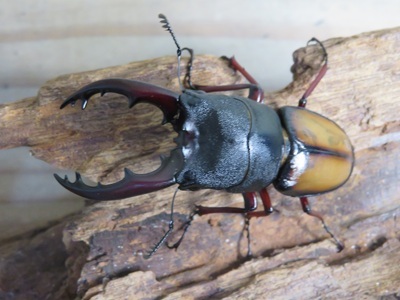 ※背中の模様が大変綺麗なアフリカを代表するノコギリクワガタです。ウムハンギノコギリは4亜種に分類されるという学説もあります。「世界のクワガタムシ大図鑑」(2010年むし社)では亜種ではなく別種とし、大アゴの上下の湾曲がゆるやかな種を本種とし、急角度なものをエリザベスノコギリとして分類されています。