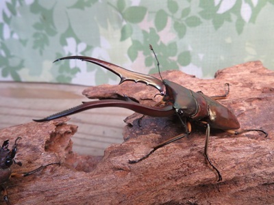 ※メタリフェルホソアカクワガタは6亜種いますが、サンギレンシスは赤茶色ベースの体に金色を帯びさせたエナメル質な艶があり、見る角度によっては金色に輝いて見えます。