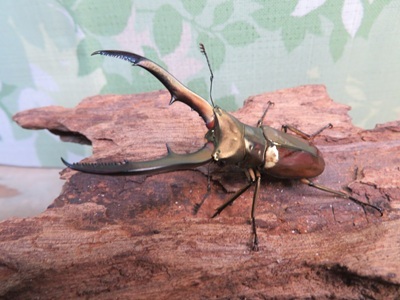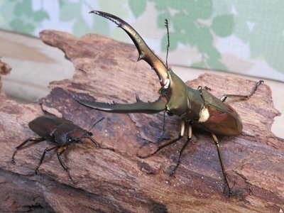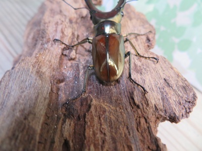 ※メタリフェルホソアカクワガタは6亜種いますが、サンギレンシスは赤茶色ベースの体に金色を帯びさせたエナメル質な艶があり、見る角度によっては金色に輝いて見えます。